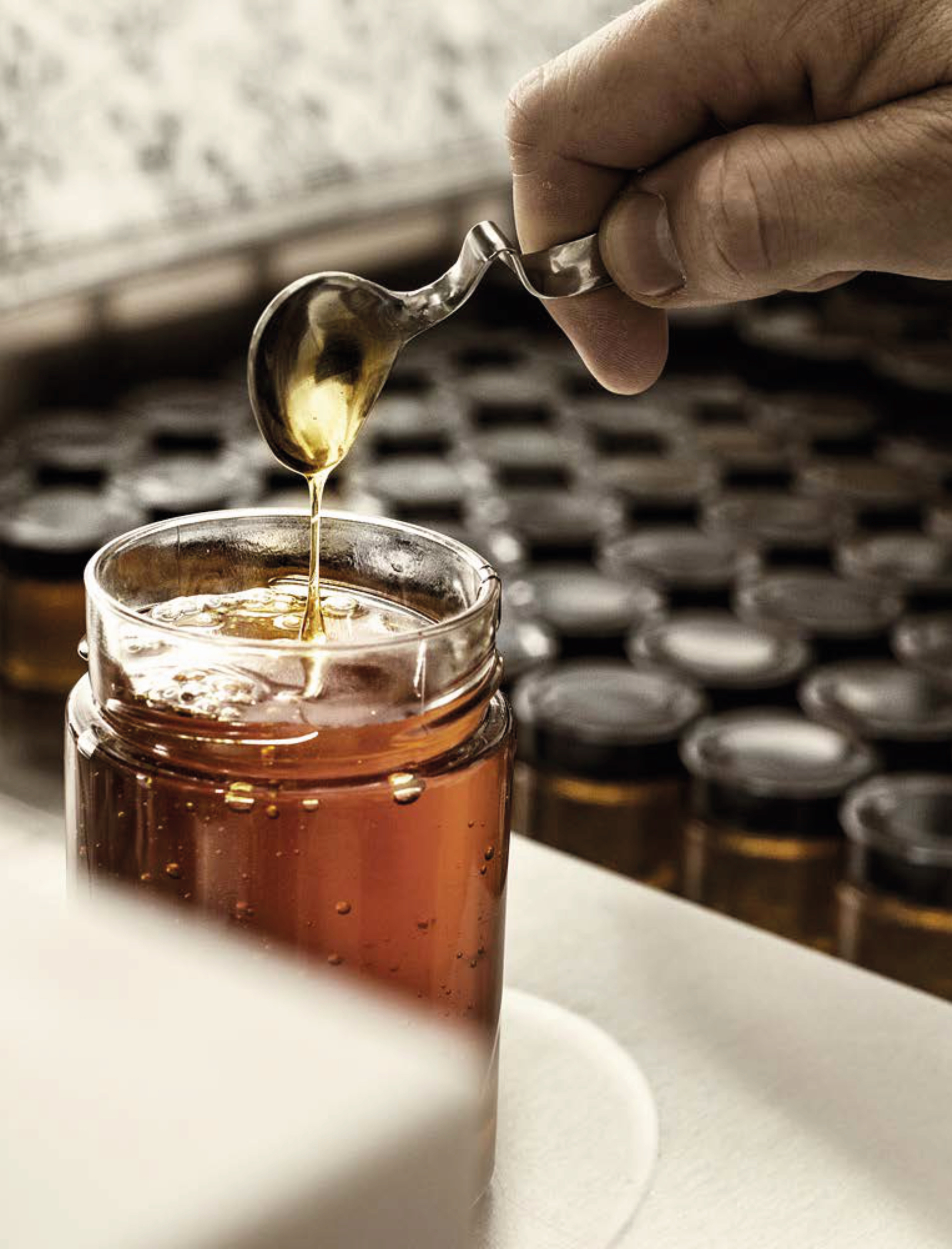 Flüssige Konsistenz, kristallisiert nach einiger Zeit fein aus, hellgelb bis bernsteinfarbig.